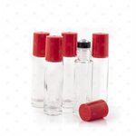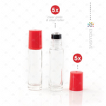 10ml Clear Glass Roller Bottle with Lipstick Kiss (Red) Lid & Premium Stainless Steel Rollerball - 5 pack (NEW STYLE)