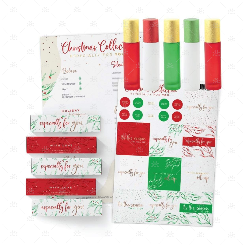 This set has the materials and recipes to make five very special Christmas Roller Bottle blends that you can present in the beautifully co-ordinated Christmas-themed boxes, each with their own cheerful and joyous looking labels to adorn the Deluxe Frosted roller bottles and metallic caps.