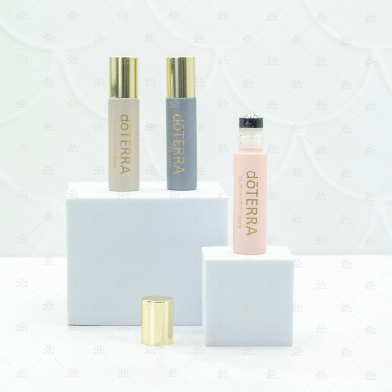 Contents: Set of 3 x 10ml dōTERRA Branded Matte Glass Roller Bottles, Premium Stainless Steel Rollers and Gold Caps.