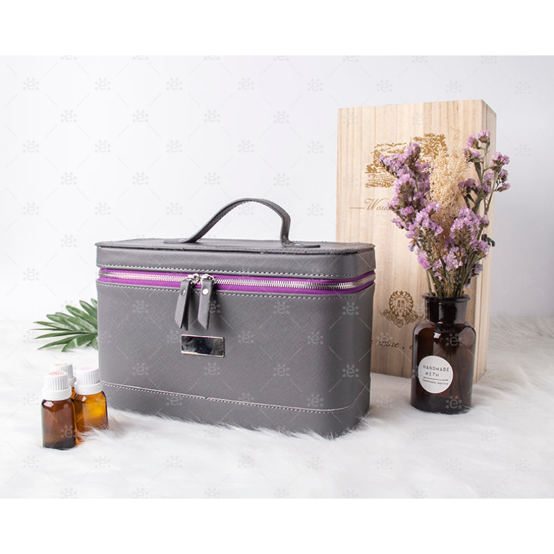 This luxurious grey faux leather and fuchsia velvet case features 2 stackable trays. Each tray holds 28 standard vials and 4 roller bottles in their own compartments. Plus, inside the lid, 9 mesh pockets store your most-used roller bottles too for easy access.
