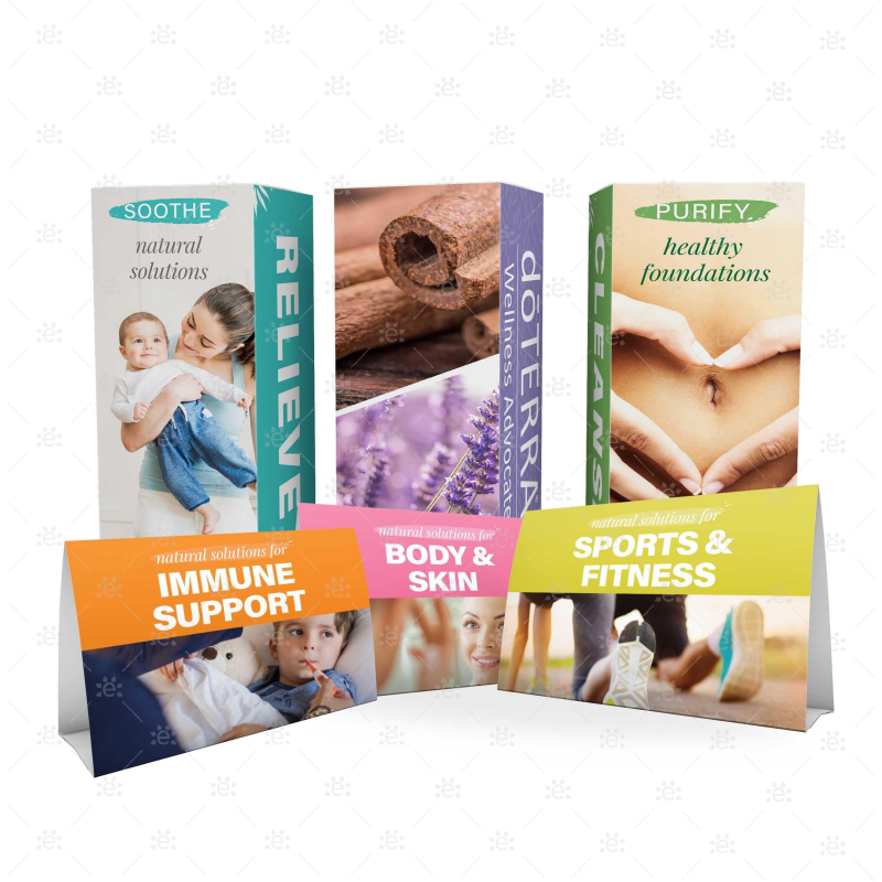 Display in style with our dōTERRA® branded business tools! Professional looking table stands that allow you to draw attention to your doTERRA products with oil-inspired designs and topical text that draws the eye to various lifestyle needs. Each display is printed on heavy weight coated card that folds flat for storage and ease of transportation.