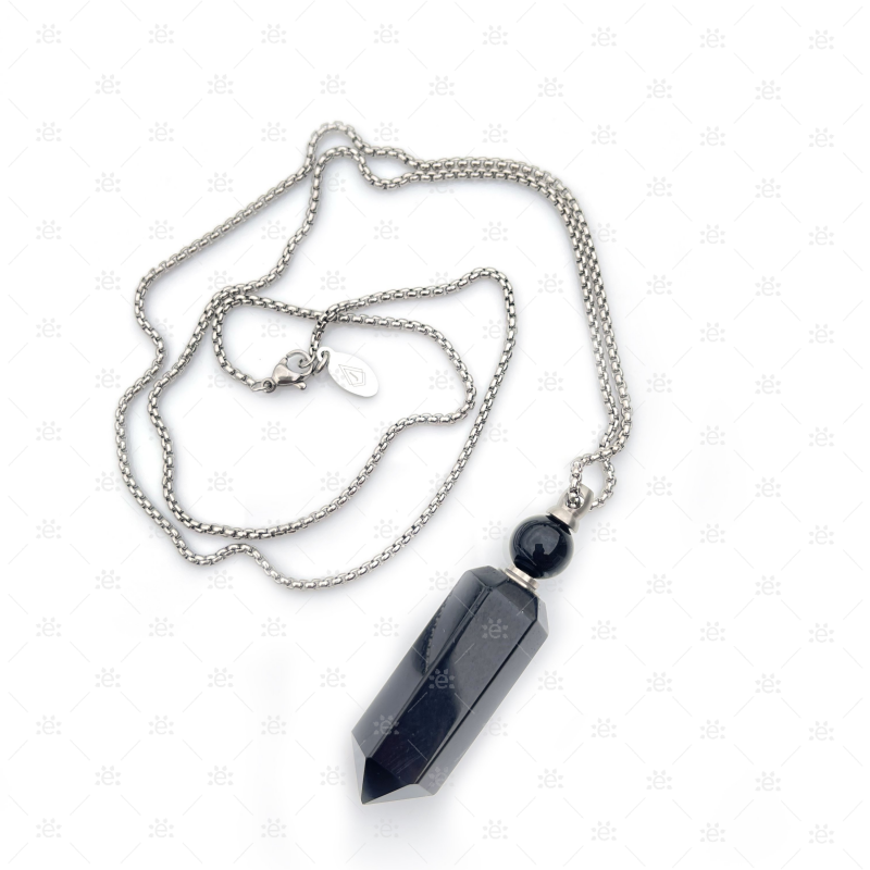 This stone is generously sized, gorgeously hand-carved & smoothed into a vial made of 100% natural crystal stone.  Each mini perfume bottle hangs from a 27" sturdy stainless steel chain. Fill the vial with your favourite essential oil or fragrance to have it at hand when you need it most and benefit from the vibrational enhancement of the crystal.