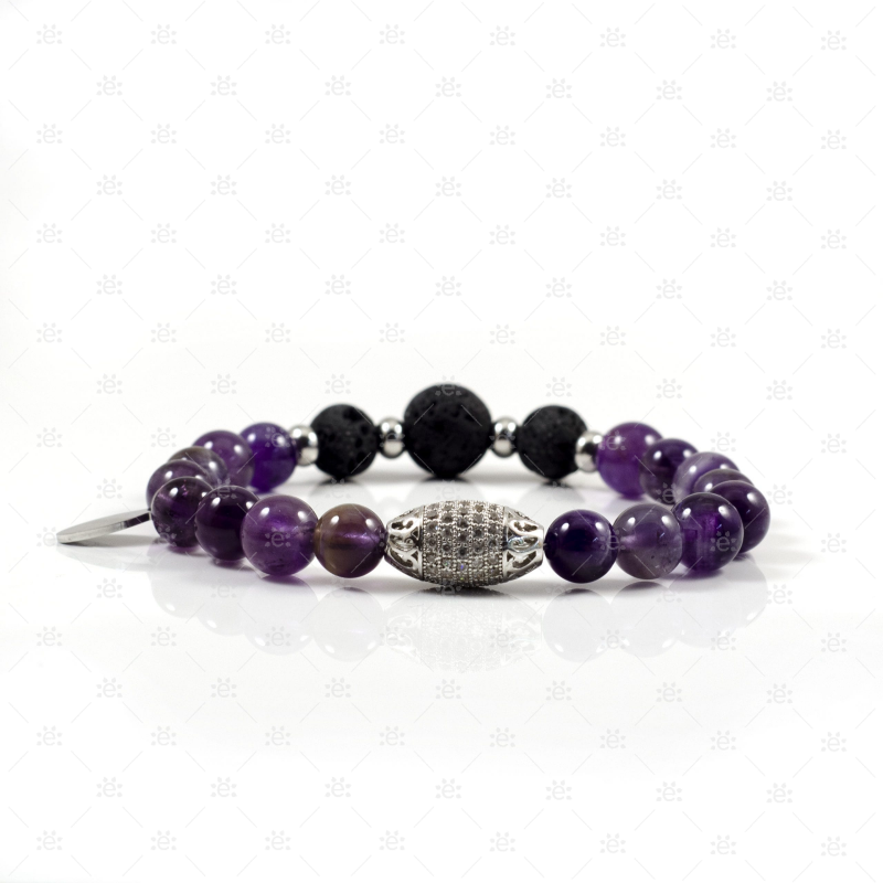 This beautiful bracelet is adorned with amethyst gemstone beads along with lava beads both with the ability to support and enhance your well-being. The bracelet is elasticated, and accented with a stainless steel diamonte oval bead and spacers.