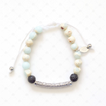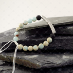 This beautiful soft coloured gemstone macrame bracelet is accented with a stainless steel diamonte bar and lava beads with their ability to support and enhance your well-being. The bracelet is adjustable by moving in and out the macrame pull chords.
